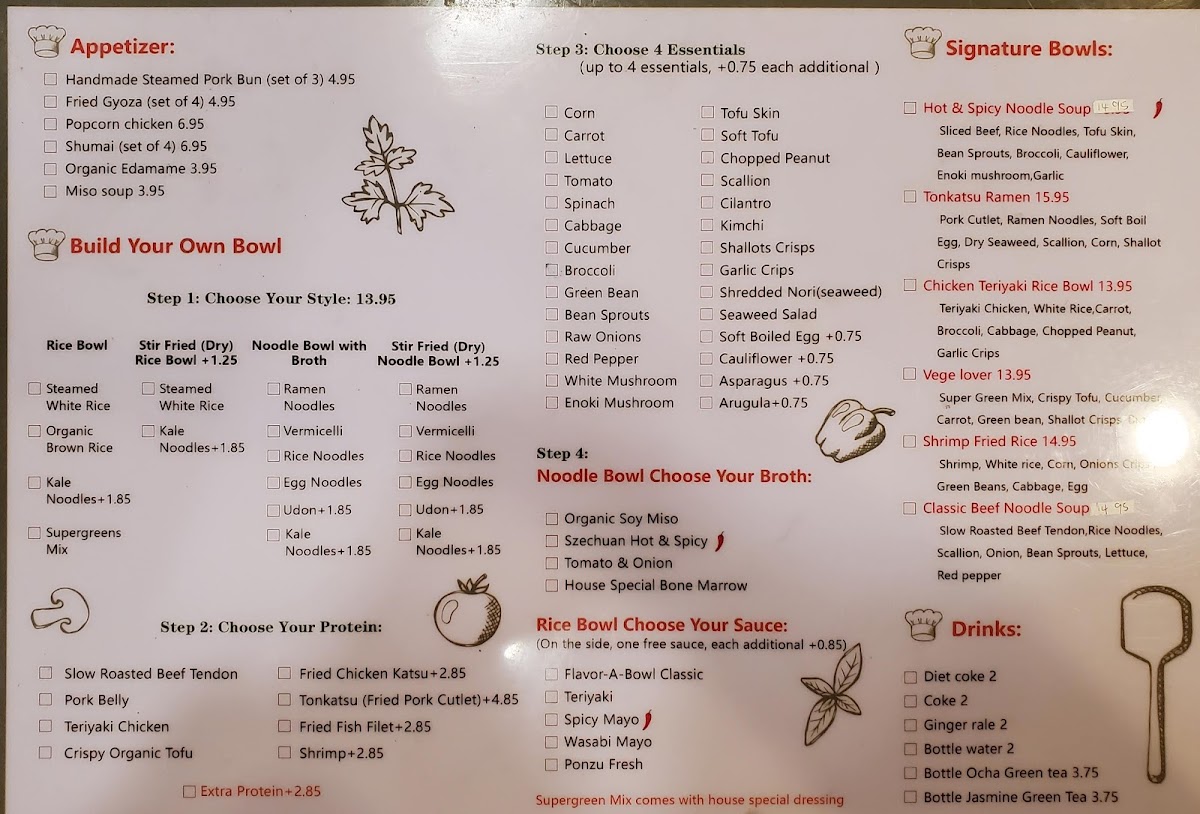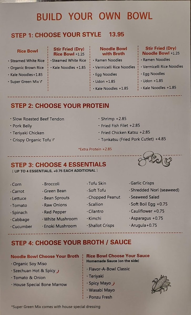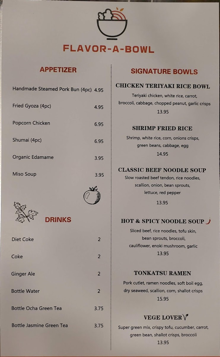 The menu is packed with a variety of options, including custom toppings to personalize your bowl just the way you like it. You can also find a selection of sides, like crispy gyoza or delicate bao buns, that pair beautifully with your main course. It’s a place where comfort food meets flavor perfection, and once you’ve had a taste, you’ll understand why it’s a local favorite. Whether you’re here for a quick lunch or a cozy dinner with friends, the menu at Flavor-A-Bowl offers something special that keeps you coming back for more.